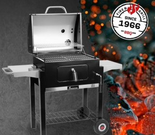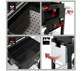Les 2 tablettes latérales sont rabattables, et la récupération des cendres est aisée grâce au tiroir à cendres amovible. Le barbecue dispose d'une grille de maintien au chaud émaillée, de grilles en fonte émaillées et de 2 roulettes.