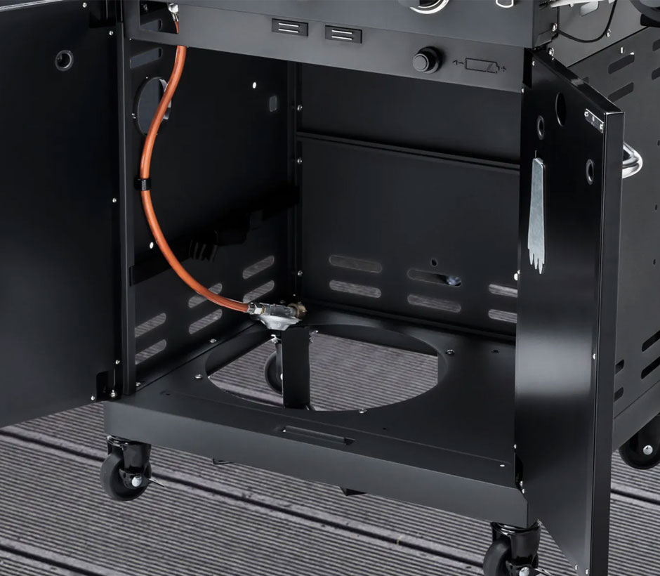 Vous pouvez à tout moment personnaliser et compléter votre barbecue Professional Power avec notre système d'accessoires MADE2MATCH. Un système de fixation solide situé dans le support du barbecue offre de l'espace pour les bouteilles de gaz de jusqu'à 11 kg. De plus, grâce à sa tablette latérale rabattable, le barbecue peut être rangé de manière compacte.