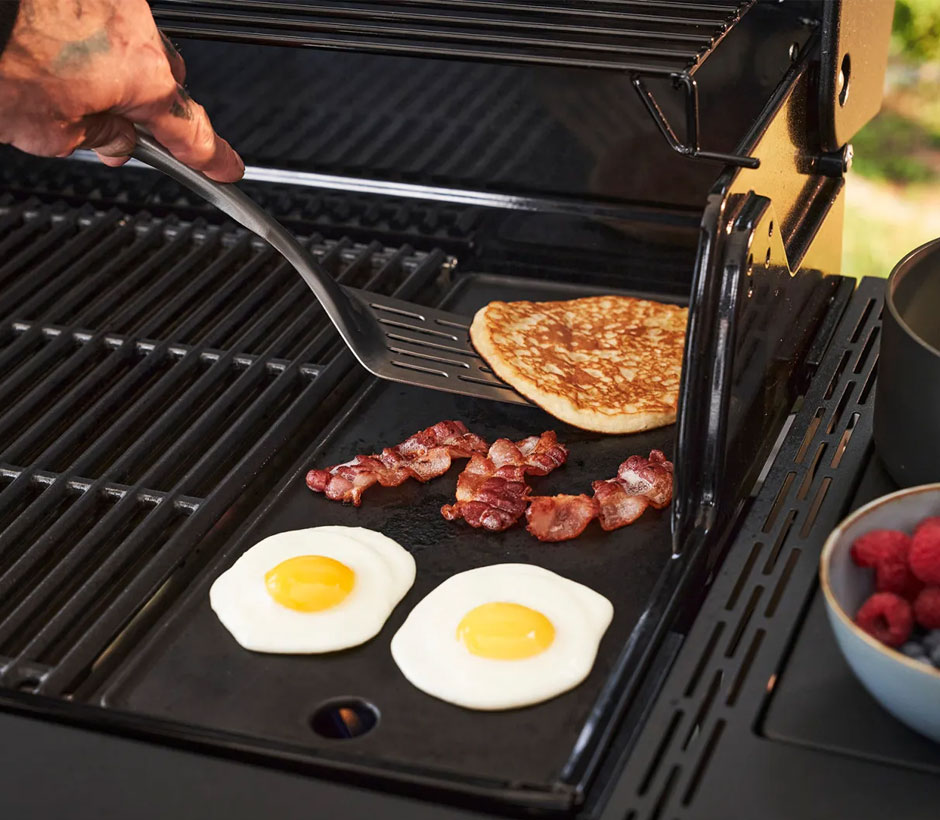 Sur la surface de cuisson principale, les grilles en fonte créent des lignes de cuisson parfaites. Quant aux brûleurs hautes performances en acier inoxydable, ils garantissent une chaleur optimale. Vous en voulez davantage ? Sur la plaque de cuisson en fonte de série, vous pouvez par exemple préparer de délicieux légumes, du fromage grillé, un œuf au plat ou encore des fruits de mer. Il vous suffira alors de fixer vos ustensiles aux deux crochets GEAR TRAX, afin de toujours les avoir à portée de main.