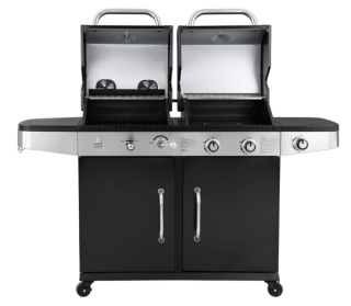 - BBQ combiné au gaz et au charbon de bois avec brûleur latéral supplémentaire pour une polyvalence de cuisson ultime.