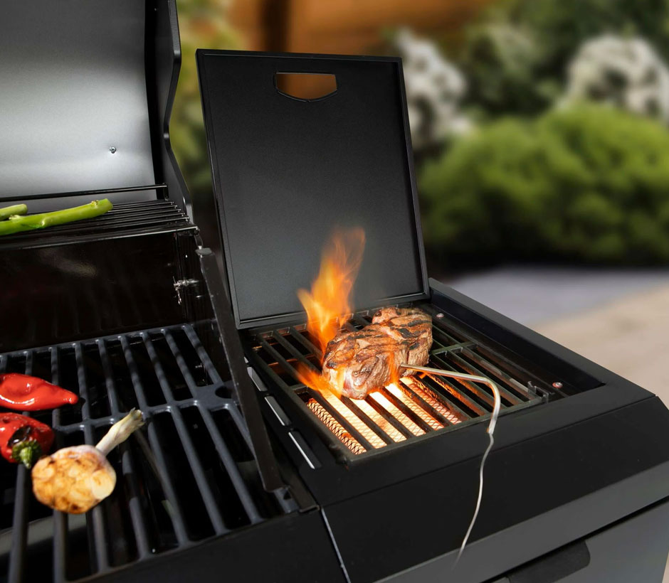 La tablette de droite est équipée d'un brûleur infrarouge haute température (3,5 kW), la Sizzle Zone permettant d'atteindre des températures extrêmement élevées, idéales pour saisir rapidement les viandes et obtenir une croûte délicieusement caramélisée.