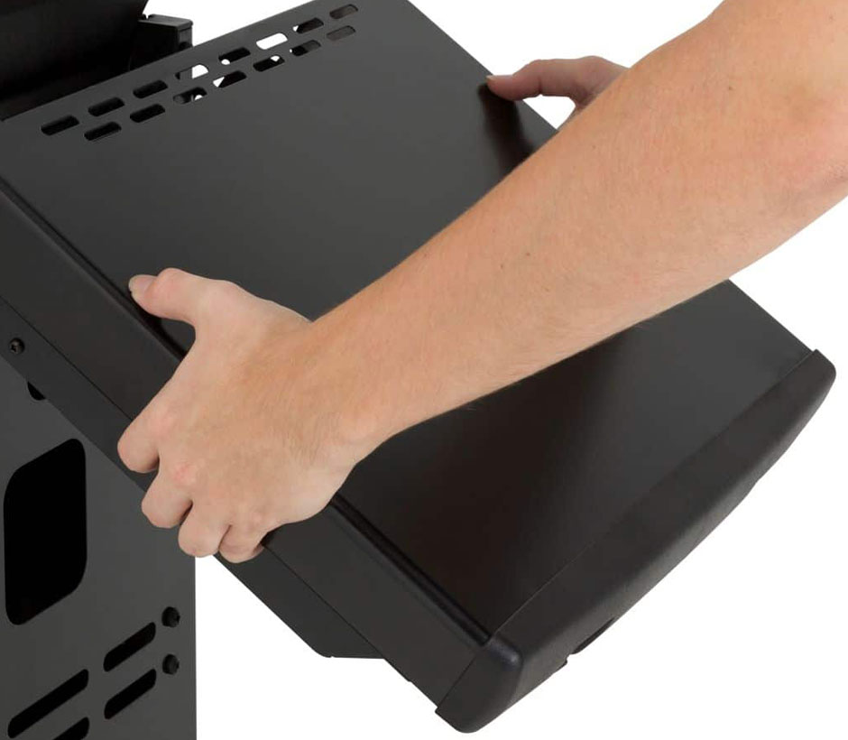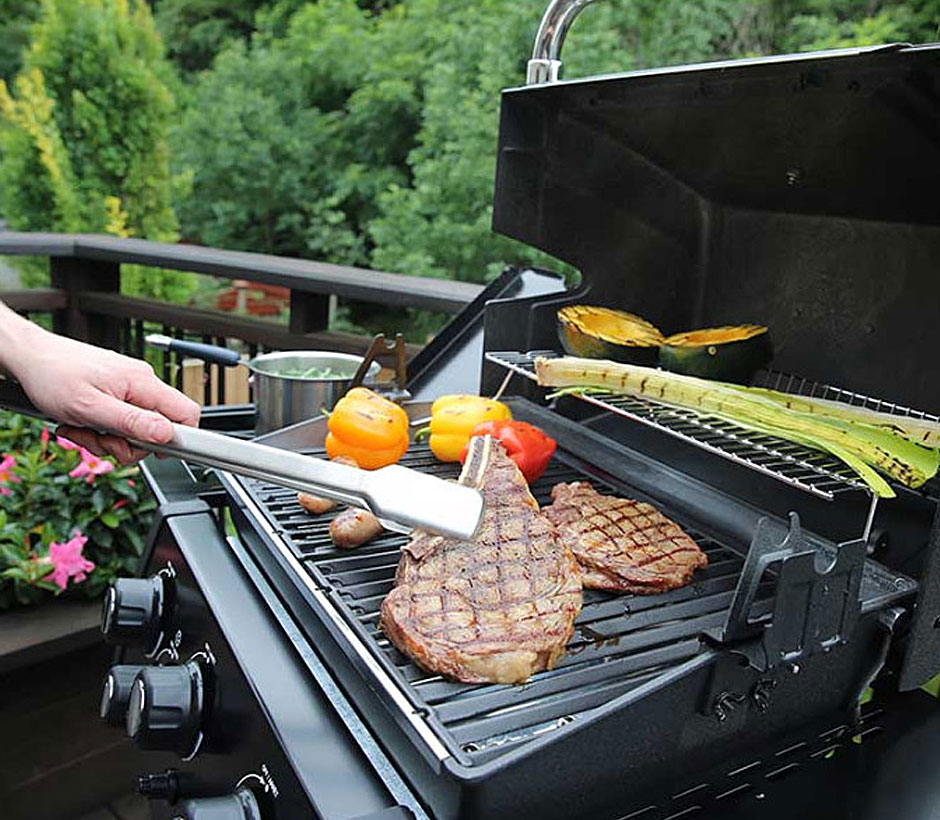 Thermomètre Deluxe Accu-Temp sur couvercle, boutons de commande Sensi-Touch, et 3 brûleurs tubulaires double flammes en inox, puissance 8.8 kw, pour une gestion optimale de la chaleur et permettre des cuissons directes à très fortes températures pour saisir un bon steak par exemple, ou des cuissons indirectes pour un faire mijoter et obtenir des viandes ou légumes tendres et succulents. Chariot en acier peint époxy noir, fermé par une porte, avec base en résine robuste offrant un emplacement pour la bouteille de gaz. 2 tablettes en acier peint époxy noir, rabattables.