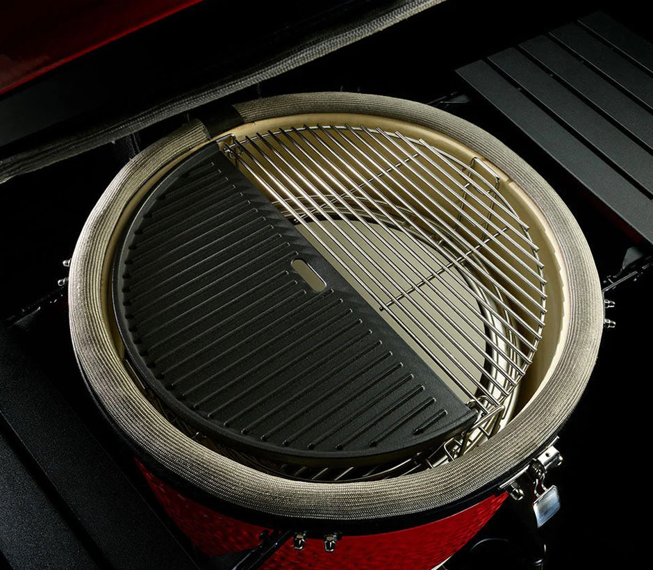 Inventée dans un esprit d'innovation, la plaque de cuisson réversible en demi-lune Kamado Joe offre deux surfaces, une lisse et une rainurée, pour une polyvalence optimale de la cuisson sur la fonte. La fonte durable offre une superbe rétention de la chaleur et peut être utilisée avec le système de cuisson flexible Divide & Conquer. Forgez une polyvalence illimitée en matière de cuisson grâce aux surfaces de Kamado Joe.