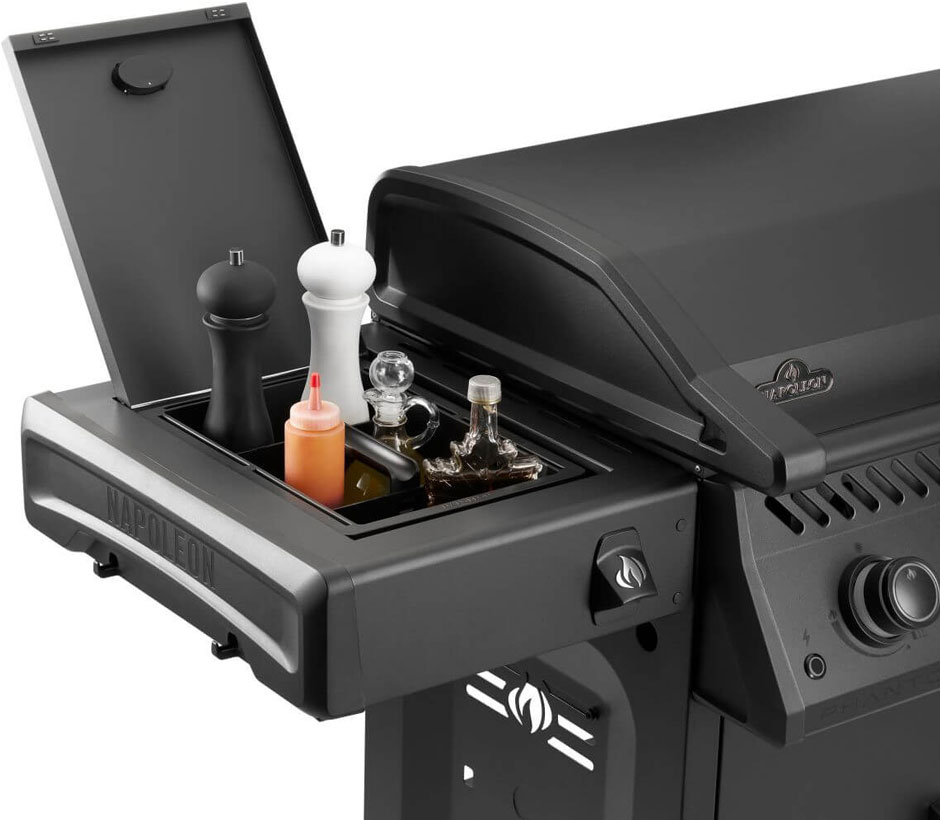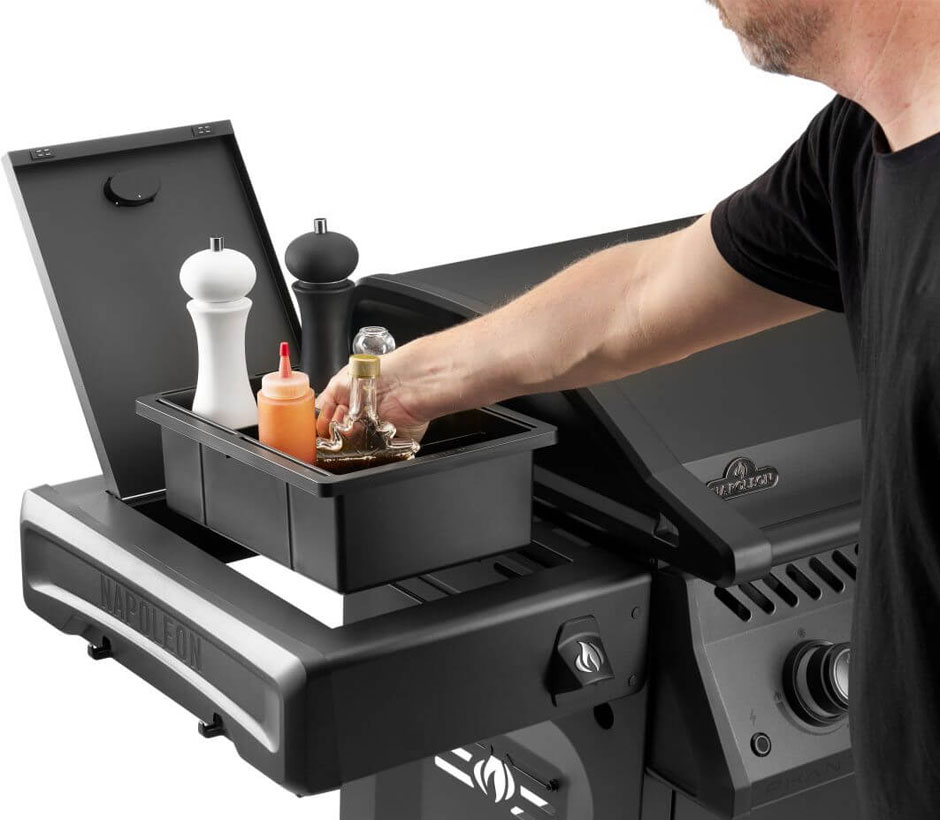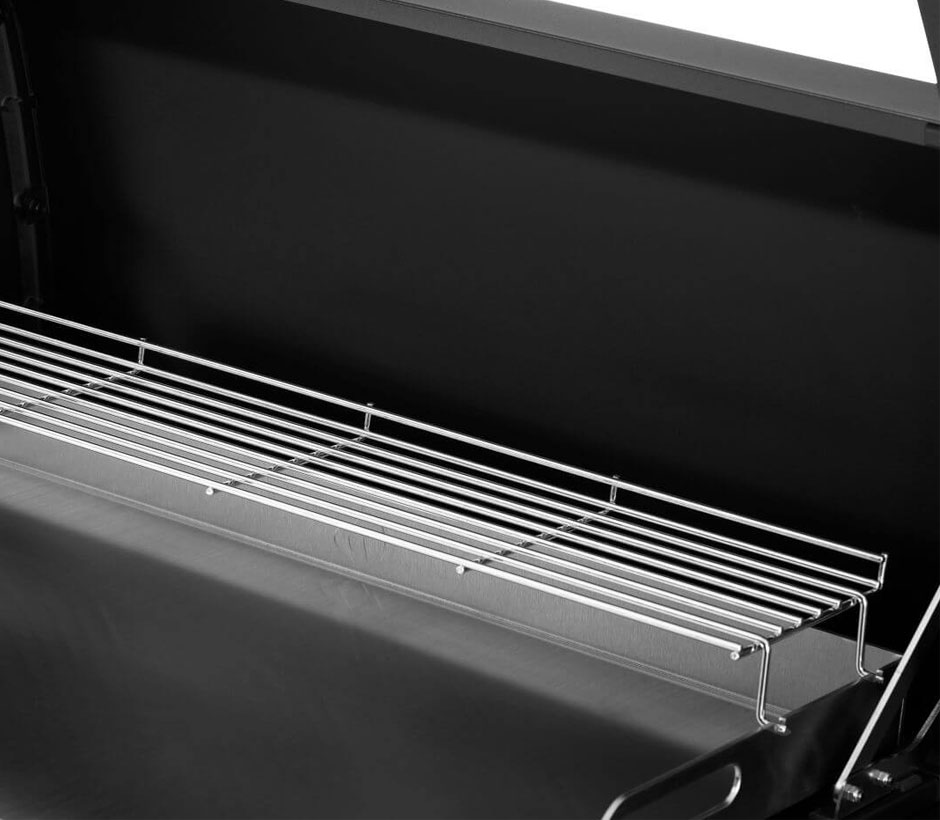 Sa tablette latérale avec chariot amovible et couvercle permettent de ranger ustensiles et ingrédients, tandis que ses étagères pliantes aux crochets intégrés offrent encore plus d’espace de rangement. Elle comprend aussi un couvercle à double pivot qui protège sa plaque de cuisson, un bac récupérateur de graisse ergonomique accessible par l’avant, des molettes de commande rétroéclairées blanches, 4 roulettes à frein et un décapsuleur très pratique. Ce chariot de plancha est conçu pour des performances durables et des grillades sans efforts.