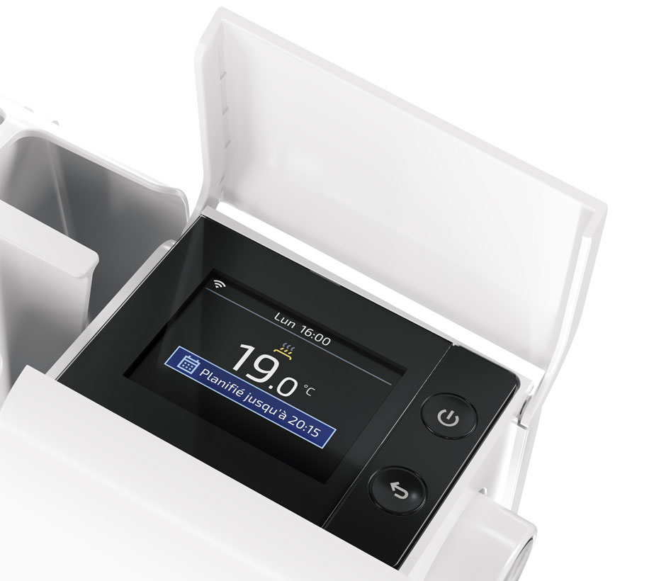 Boîtier de commandes digitales. Touche AUTO pour activer le pilotage automatique. Fonction détection automatique de fenêtre ouverte/fermée et d'occupation. Indicateur de consommation.